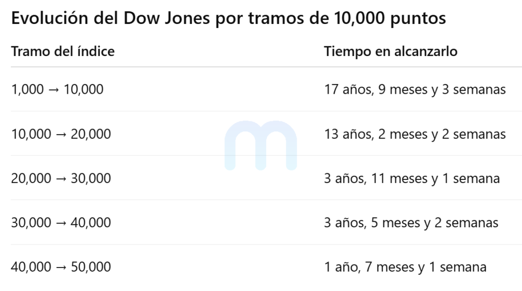 Una forma clara de verlo es observando el tiempo que le tomó al Dow Jones avanzar cada tramo de 10,000 puntos. La tendencia muestra que los últimos escalones se alcanzaron en plazos cada vez más cortos.